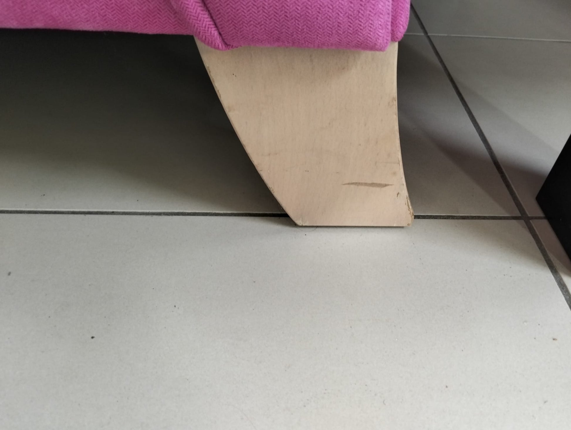 The material looks like hot pink velvet but is a hard-wearing and durable, closely woven type cord like material. Has been totally scotch guarded. No marks or stains on the velvet-like material. Legs have some minor wear as per photos but is not noticeable in viewing the lounge. Because it is handmade it is very heavy. Original price well over $10,000.