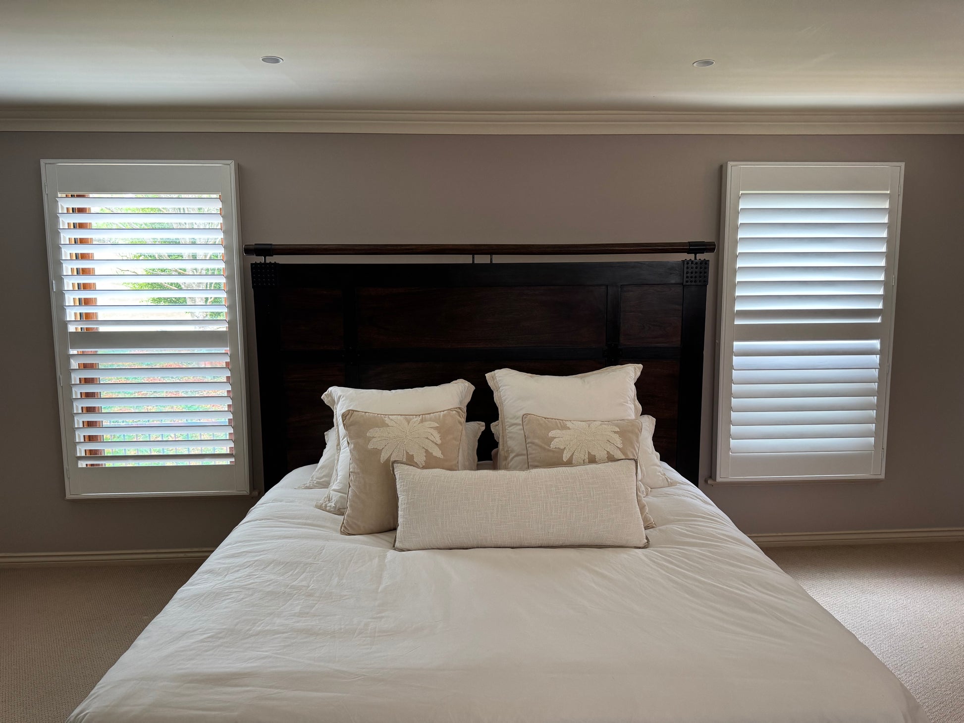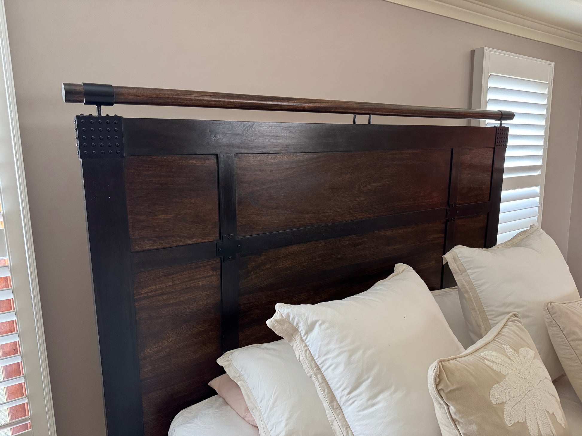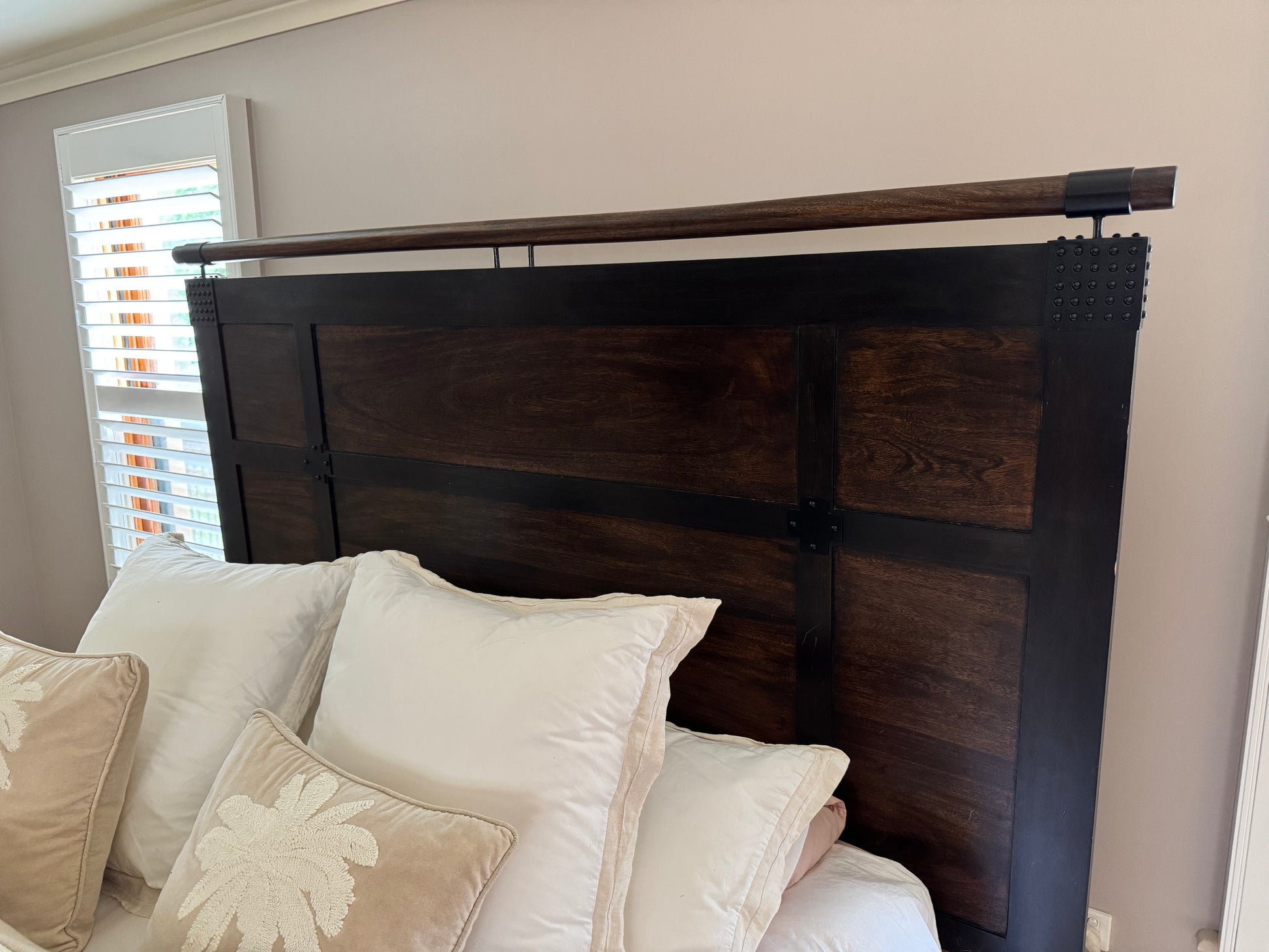 Elevate your bedroom with this imposing and stylish bedhead. Crafted from rich, dark timber panels framed by robust black metal with distinctive rivet details. Features a striking top rail, perfect for a modern rustic or industrial aesthetic. A durable and visually impactful piece in excellent pre-loved condition.